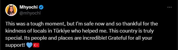 “Bu zor bir andı, ama şimdi güvendeyim ve bana yardım eden Türkiye’deki yerel halkın nezaketine çok minnettarım. Bu ülke gerçekten özel. İnsanları ve yerleri inanılmaz! Tüm desteğiniz için minnettarım!”