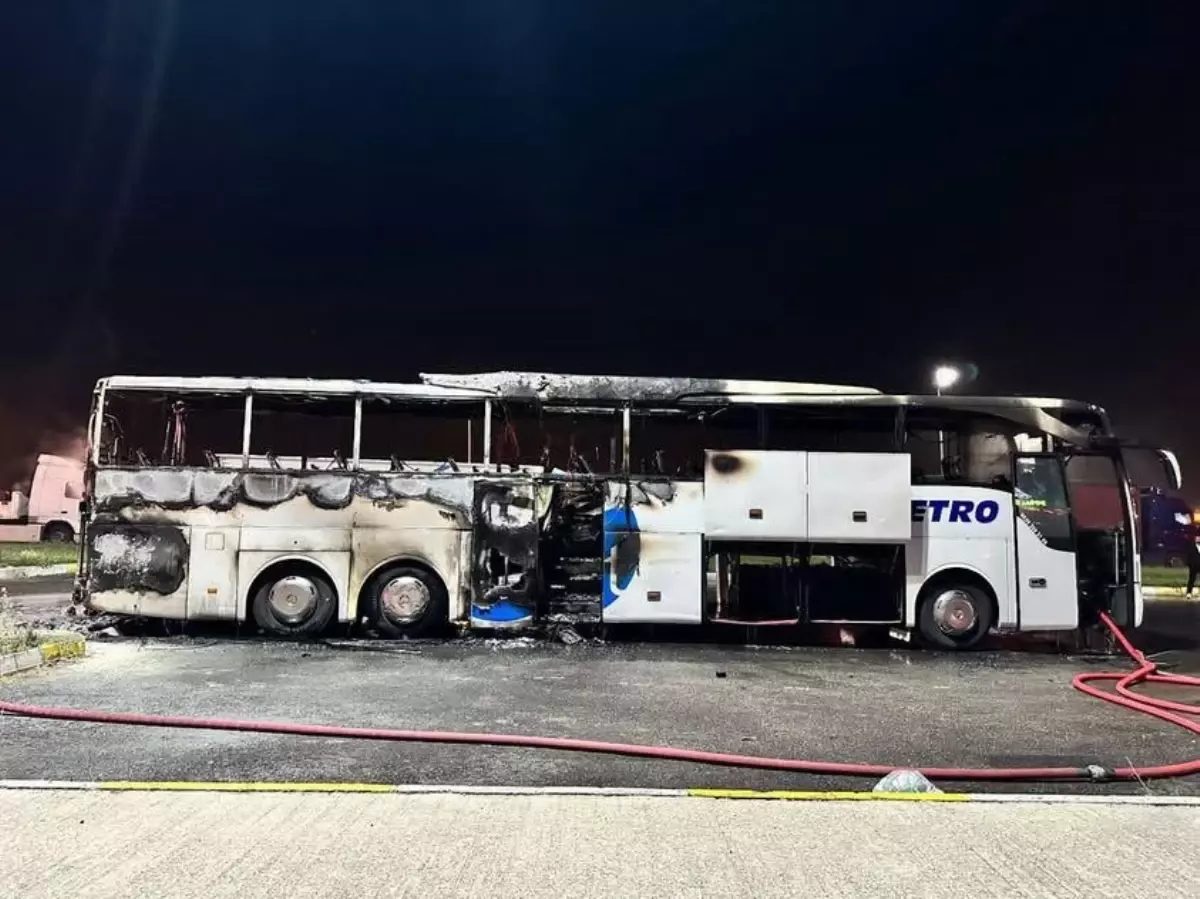 TEM Otoyolu Kocaeli’nin Körfez ilçesi geçişindeki dinlenme tesisinde duran şehirler arası yolcu otobüsü alev alev yandı. İtfaiyenin müdahalesiyle yangın söndürüldü ancak otobüs kullanılamaz hale geldi.
