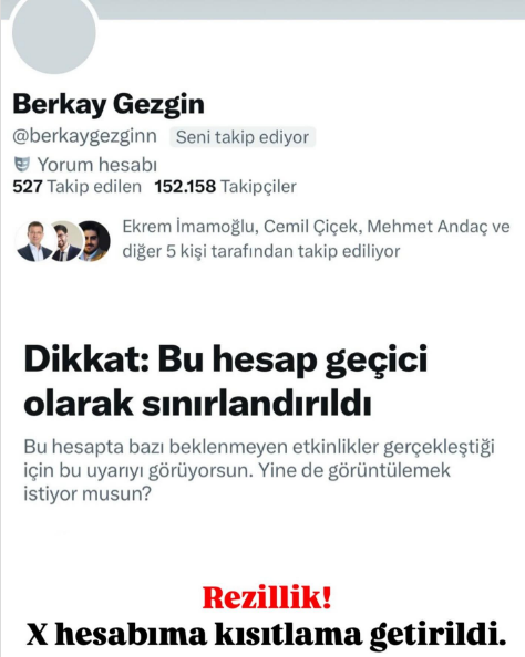 İmamoğlu’nun hesabının erişime engellenmesinin ardından X kullanıcıları profil fotoğraflarını Ekrem İmamoğlu ile değiştiriyordu. CHP Parti Meclisi Üyesi Berkay Gezgin de kendi X hesabının profil fotoğrafına Ekrem İmamoğlu’nu koymuştu.