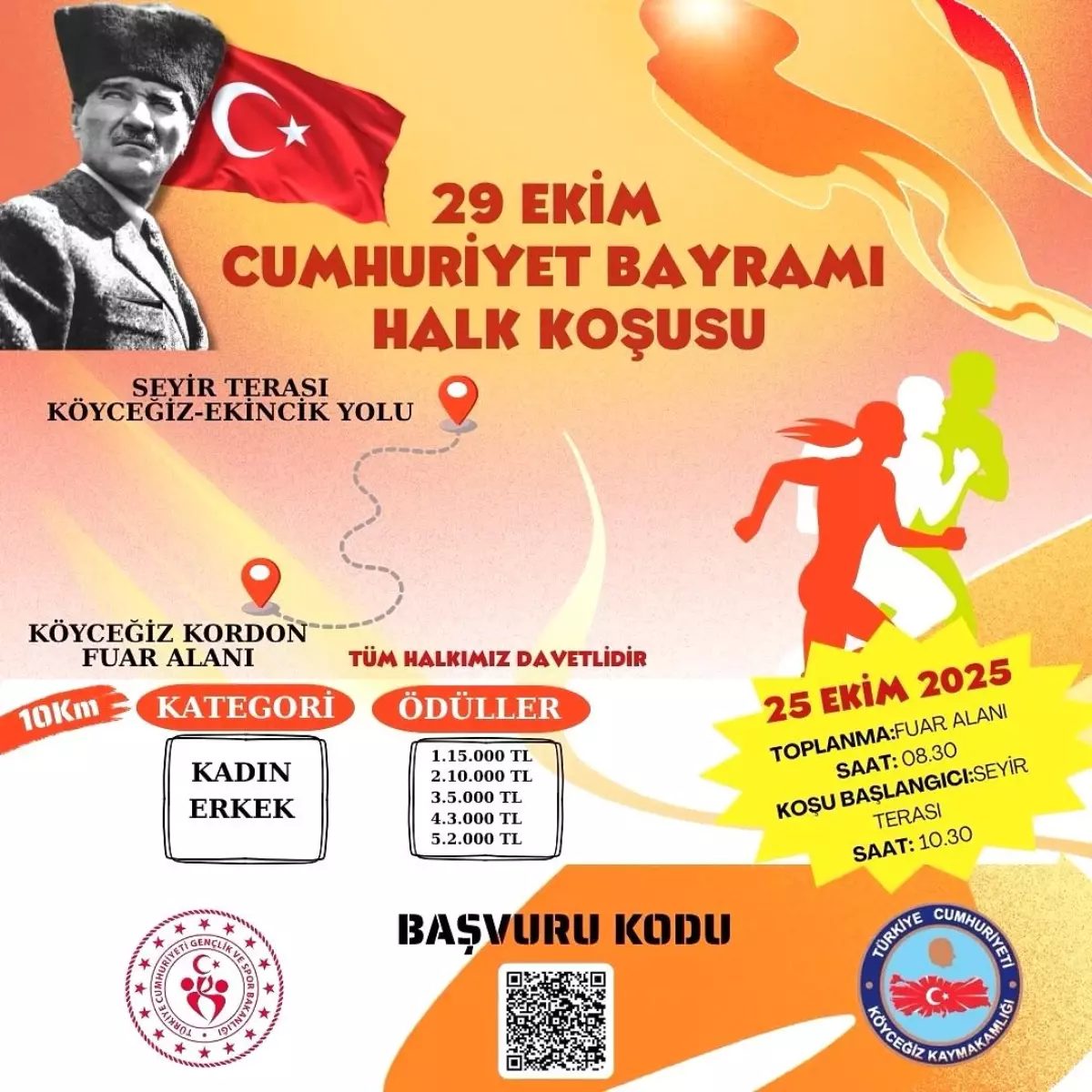 29 Ekim Cumhuriyet Bayramı halk koşusuna katılacak sporcular 25 Ekim 2025 tarihinde Köyceğiz Atatürk Kordonu Fuar Alanı’nda saat 08.30’da toplanacak. Sporcular koşu başlangıç noktası olan Köyceğiz Ekincik Yolu Seyir Terası’na taşınacak. 29 Ekim Cumhuriyet Bayramı halk koşusu saat 10.30’da Köyceğiz Ekincik Yolu Seyir Terası’ndan başlayacak, Köyceğiz Atatürk Kordonu Fuar Alanı’nda sona erecek. 10 Km’lik 29 Ekim Cumhuriyet Bayramı halk koşusunda para ödülü verilecek. Kadın ve Erkek kategorilerinde dereceye giren sporculara ödülleri takdim edilecek. Katılım için afişte yer alan başvuru koduna veya başvuru linkine tıklayarak başvuru yapılabilecek. Köyceğiz Kaymakamlığı tarafından 29 Ekim Cumhuriyet Bayramı halk koşusuna, Cumhuriyetin coşkusunu yaşamak için tüm halk davet edildi. – MUĞLA