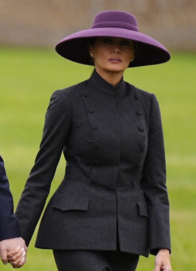 Daha önce Donald Trump’ın ocak ayındaki yemin töreninde tercih ettiği şapkayla gündem olan First Lady, bu kez de seçimiyle konuşuldu. Melania Trump, Windsor Kalesi’ne geniş kenarlı, yüzünü büyük ölçüde kapatan mor bir şapka ile geldi. Moda uzmanı ve Vogue yazarı Marian Kwei, bu tercihin “tesadüf olmadığını” vurguladı.