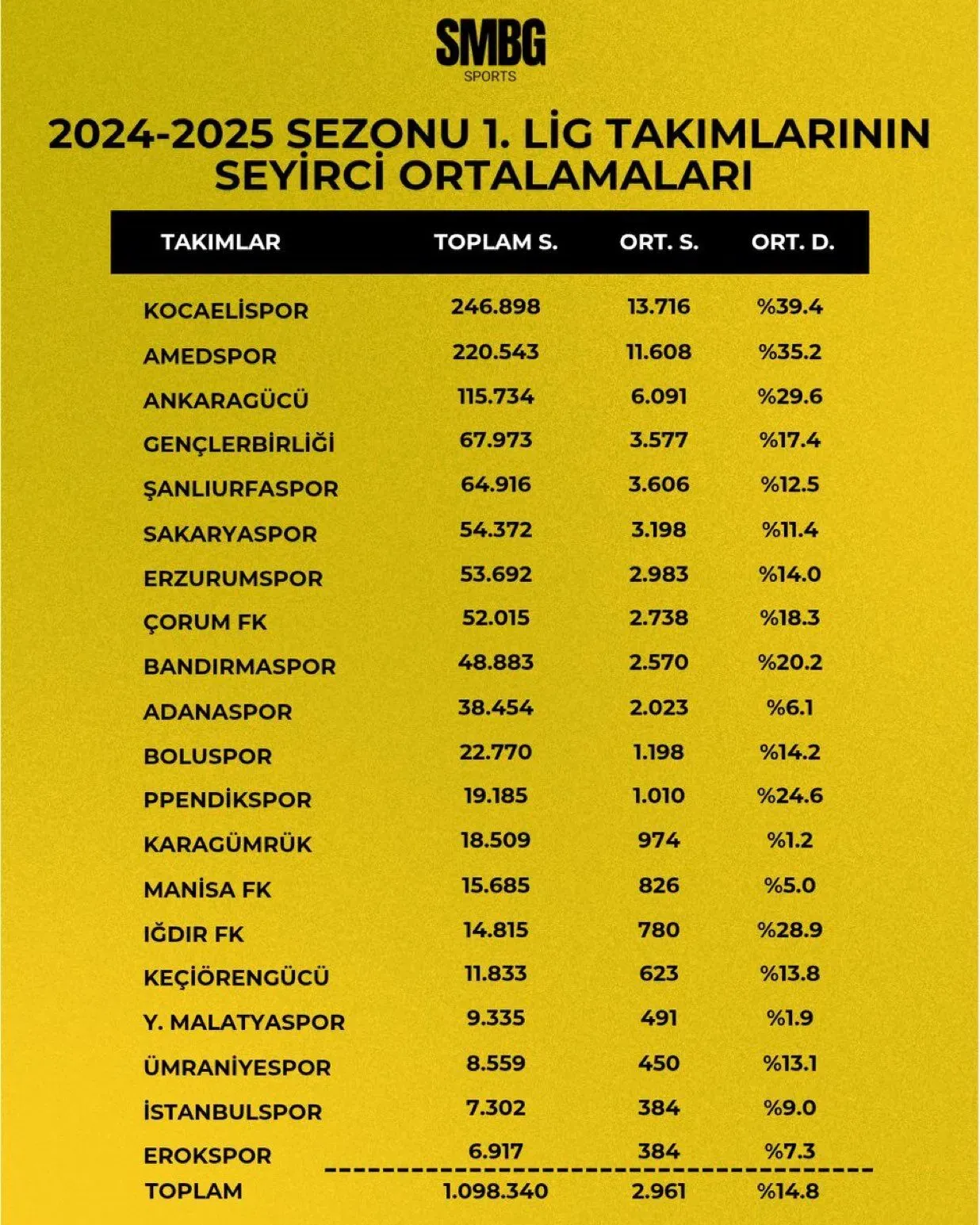 Paylaşılan veriler doğrultusunda Adanaspor, sezon boyunca toplamda 38 bin 454 taraftarı tribünlere çekerek seyirci ortalaması açısından ligin 10. sırasında yer aldı.
