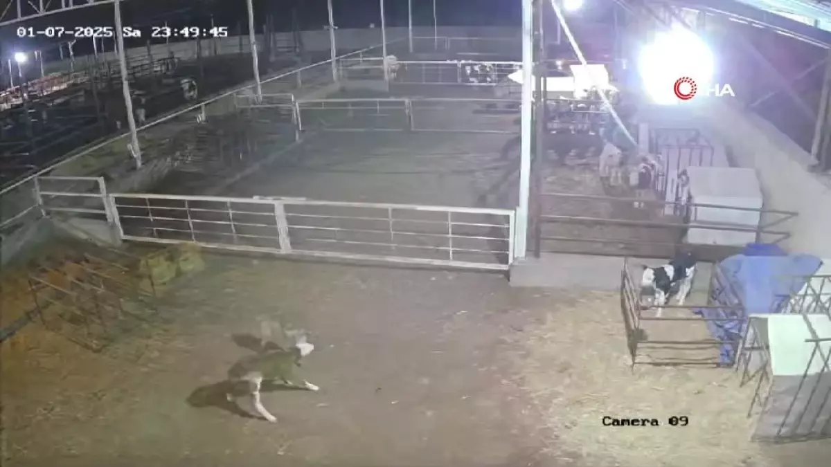 Kayseri'de aç kalan bir kurt, çiftlikteki danaya saldırdı. Saldırı güvenlik kamerasına yansıdı.