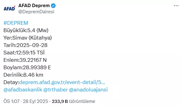 Afet ve Acil Durum Yönetimi Başkanlığının (AFAD) internet sitesinde yer alan bilgiye göre, merkez üssü Simav ilçesi olan 5.4 büyüklüğünde sarsıntı kaydedildi.