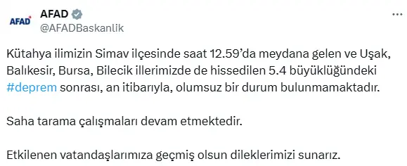 Deprem sonrası AFAD’dan yapılan açıklamada; “Kütahya ilimizin Simav ilçesinde saat 12.59’da meydana gelen ve Uşak, Balıkesir, Bursa, Bilecik illerimizde de hissedilen 5.4 büyüklüğündeki #deprem sonrası, an itibarıyla, olumsuz bir durum bulunmamaktadır. Saha tarama çalışmaları devam etmektedir. Etkilenen vatandaşlarımıza geçmiş olsun dileklerimizi sunarız” ifadeleri yer aldı.