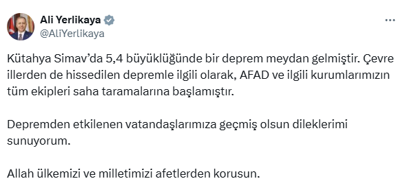 İçişleri Bakanı Ali Yerlikaya “Kütahya Simav’da 5,4 büyüklüğünde bir deprem meydan gelmiştir. Çevre illerden de hissedilen depremle ilgili olarak, AFAD ve ilgili kurumlarımızın tüm ekipleri saha taramalarına başlamıştır. Depremden etkilenen vatandaşlarımıza geçmiş olsun dileklerimi sunuyorum. Allah ülkemizi ve milletimizi afetlerden korusun.” açıklamasında bulundu.