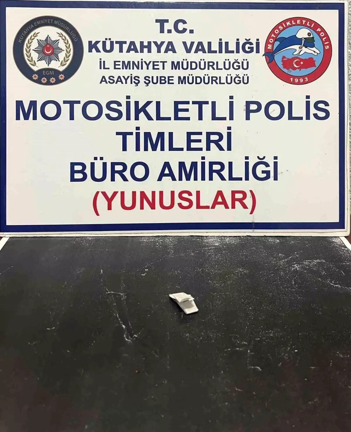 Kütahya’da Motosikletli Polis Timleri tarafından gerçekleştirilen uygulamada bir kişinin telefon kılıfının arka kısmında uyuşturucu madde ele geçirildi.