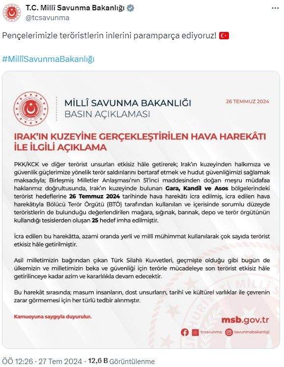 Milli Savunma Bakanlığı’ndan harekete ilişkin yapılan açıklamada şu ifadelere yer verildi: “PKK/KCK ve diğer terörist unsurları etkisiz hâle getirerek; Irak’ın kuzeyinden halkımıza ve güvenlik güçlerimize yönelik terör saldırılarını bertaraf etmek ve hudut güvenliğimizi sağlamak maksadıyla; Birleşmiş Milletler Anlaşması’nın 51’inci maddesinden doğan meşru müdafaa haklarımız doğrultusunda, Irak’ın kuzeyinde bulunan Gara, Kandil ve Asos bölgelerindeki terörist hedeflerine 26 Temmuz 2024 tarihinde hava harekâtı icra edilmiş, icra edilen hava harekâtıyla Bölücü Terör Örgütü (BTÖ) tarafından kullanılan ve içerisinde sorumlu düzeyde teröristlerin de bulunduğu değerlendirilen mağara, sığınak, barınak, depo ve terör örgütünün kullandığı tesislerden oluşan 25 hedef imha edilmiştir.