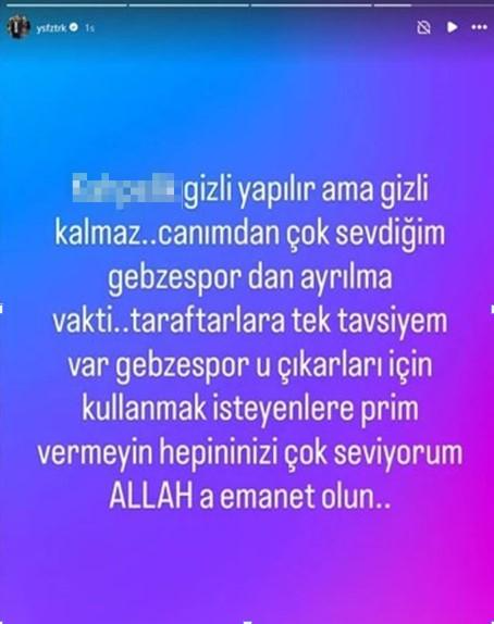 Ağır sözler sarf edenYusuf İzzettin Öztürk, ‘K**pelik gizli yapılır ama gizli kalmaz. Canımdan çok sevdiğim Gebzespor’dan ayrılma vakti. Taraftarlara tek tavsiyem var: Gebzespor’u çıkarları için kullanmak isteyenlere prim vermeyin. Hepinizi seviyorum. Allah’a emanet olun.” ifadelerini kullandı.