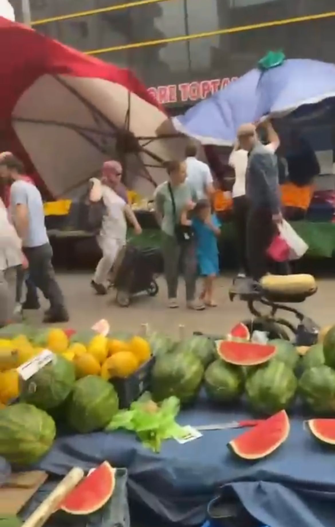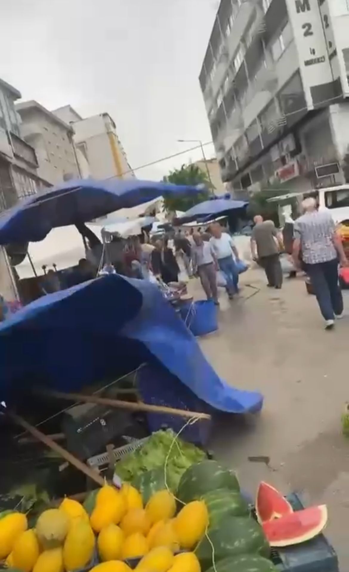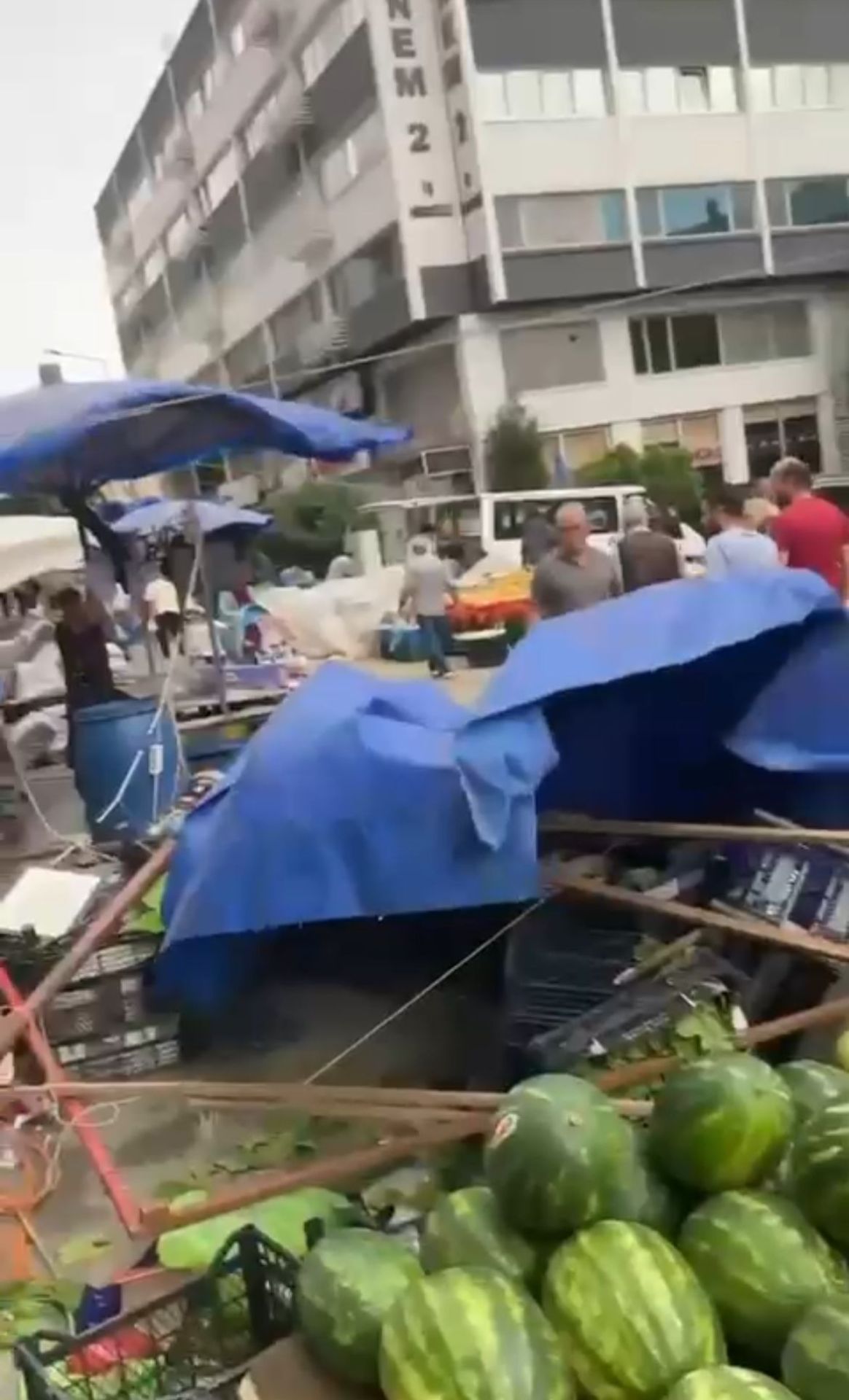 Pazarcıların devrilen çadırları uçmaması için tuttuğu anlar cep telefonu kamerasıyla kaydedildi.