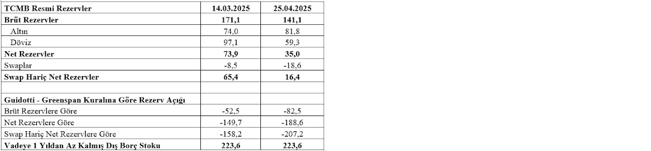 Eğilmez, tabloda, TCMB rezervlerinde son 5 haftada görülen değişim ile rezervlerle vadesine 1 yıldan az süre kalmış dış borçları karşılaştıran Guidotti – Greenspan Kuralının son durumunun yer aldığını aktardı.