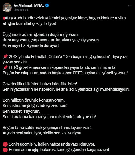 Selvi’nin bu sözlerine yanıt gecikmedi. Sosyal medya hesabından Selvi’nin zamanında FETÖ lideri Gülen için yazdığı, “Hocam Türkiye’ye dön artık” başlıklı köşe yazısının ekran görüntüsünü paylaştı. “Bugün bana saldırarak geçmişini temizleyemezsin! Arşivin seni yalanlıyor, sicilin seni ele veriyor!” sözlerini kullanan Tanal’ın yanıtı şu şekilde: