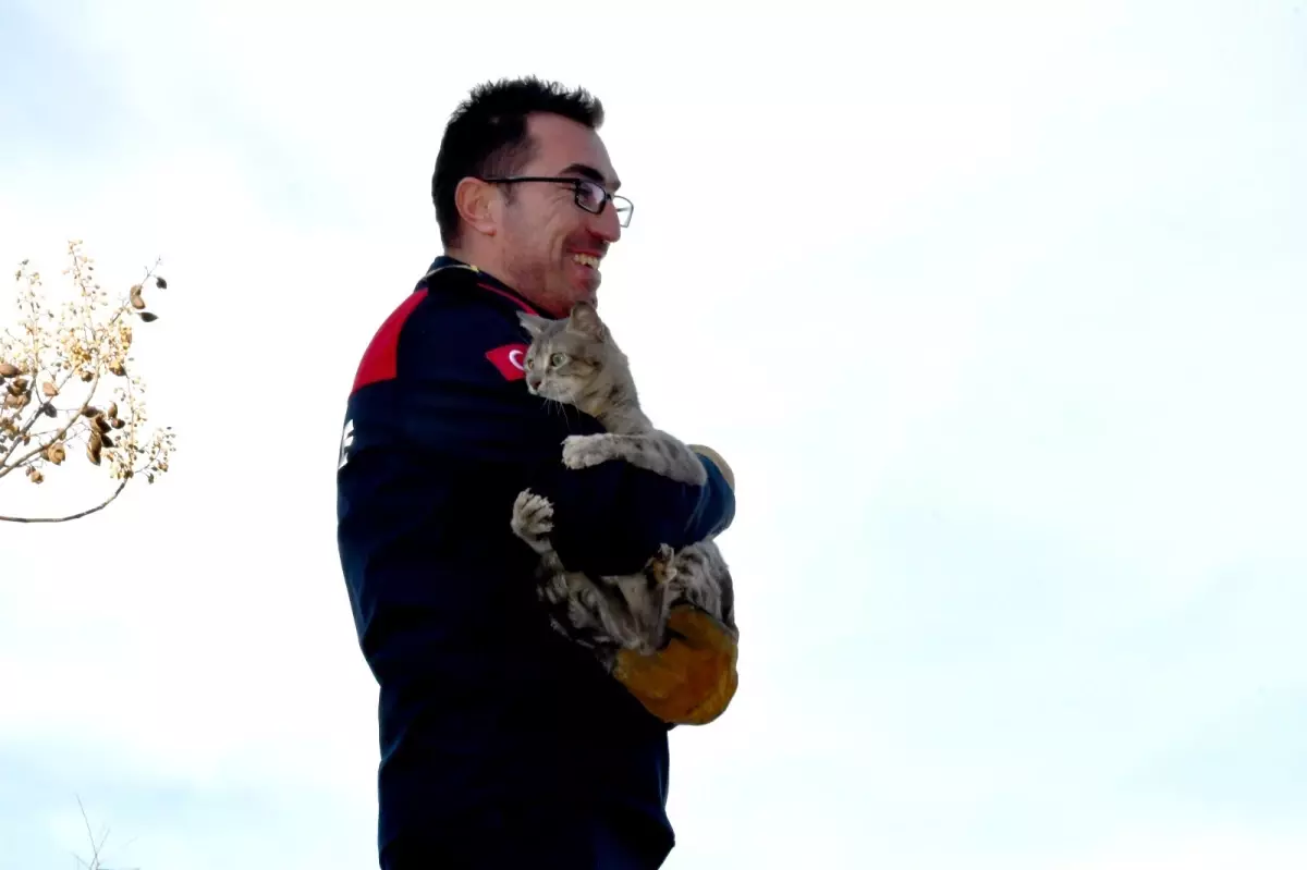 ZONGULDAK’ın Alaplı ilçesinde, bir ağacın üzerinde mahsur kalan sokak kedisi, kendisini kurtaran itfaiye personelinin kucağından bir süre inmek istemedi.