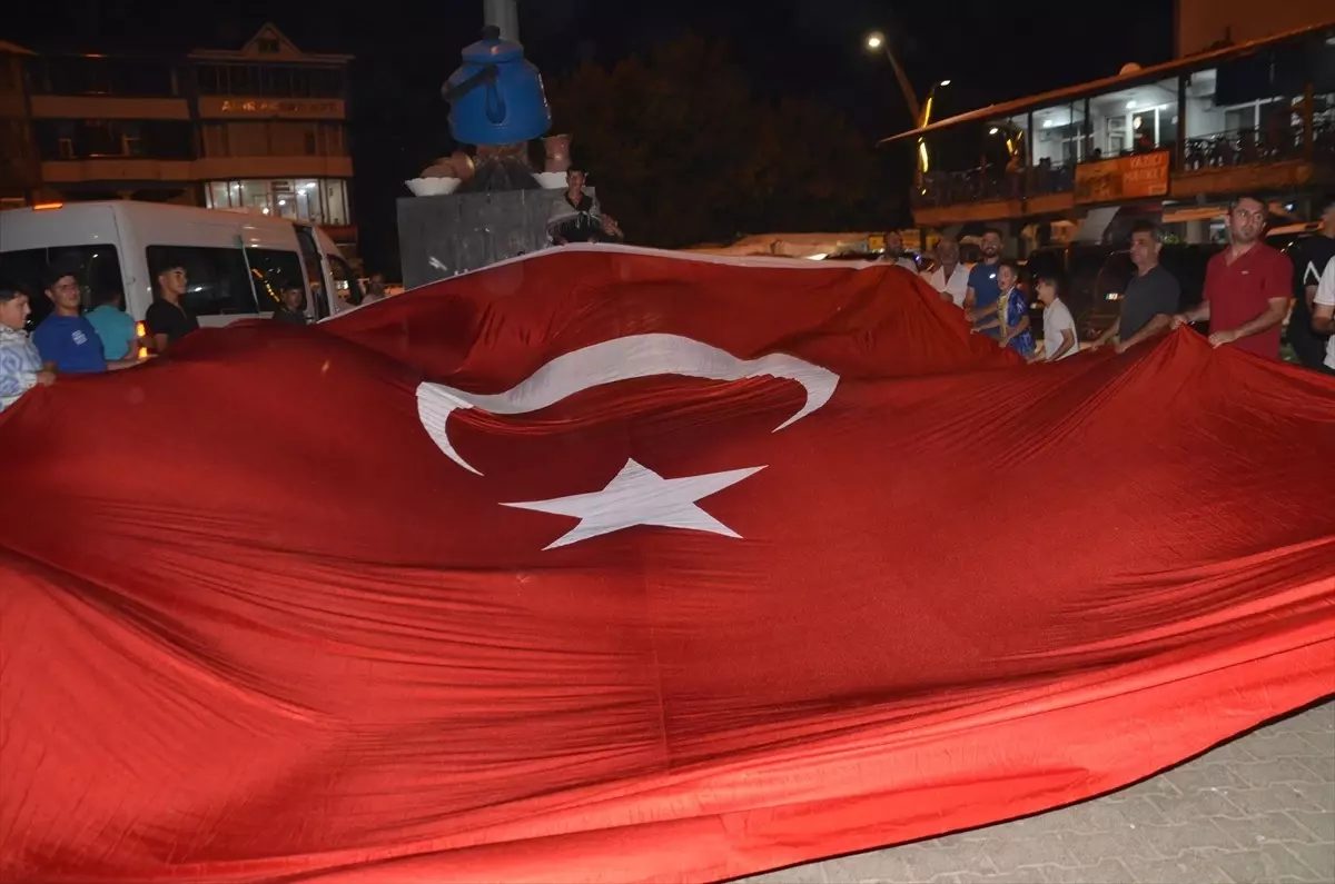 Hasköy ilçesinde vatandaşlarla bir araya gelen dernek üyeleri, ilçe meydanında meşale yaktı, 6 metrelik Türk bayrağını dalgalandırdı.