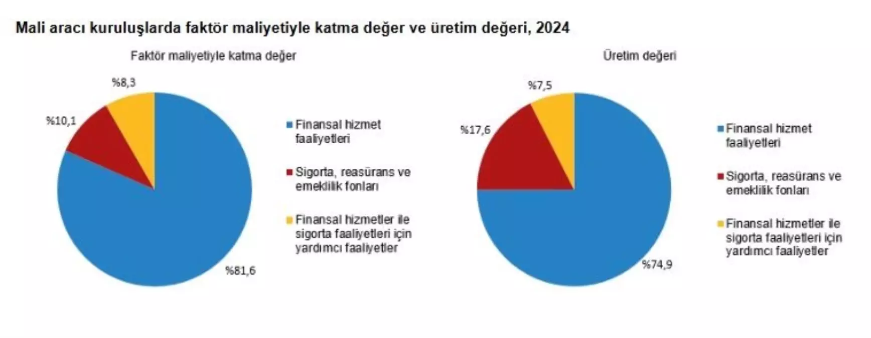TÜİK, 2024 yılına ilişkin mali aracı kuruluş istatistiklerini açıkladı. Buna göre; mali aracı kuruluşlar sektöründe 2024 yılında 21 bin 463 girişim faaliyette bulundu. Finansal hizmet faaliyetlerinde 295 girişim, sigorta, reasürans ve emeklilik fonlarında 75 girişim, finansal hizmetler ile sigorta faaliyetleri için yardımcı faaliyetlerde ise 21 bin 93 girişim faaliyet gösterdi. Faktör maliyetiyle katma değer 1 trilyon 734 milyar TL, üretim değeri ise 2 trilyon 882 milyar TL olarak gerçekleşti. Mali aracı kuruluşlarda toplam katma değerin yüzde 81,6’sı finansal hizmet faaliyetlerinde, yüzde 10,1’i sigorta, reasürans ve emeklilik fonları faaliyetlerinde, yüzde 8,3’ü ise finansal hizmetler ile sigorta faaliyetleri için yardımcı faaliyetlerde oluştu. Üretim değerinin ise yüzde 74,9’u finansal hizmet faaliyetlerinde, yüzde 17,6’sı sigorta, reasürans ve emeklilik fonları faaliyetlerinde, yüzde 7,5’i ise finansal hizmetler ile sigorta faaliyetleri için yardımcı faaliyetlerde oluştu.