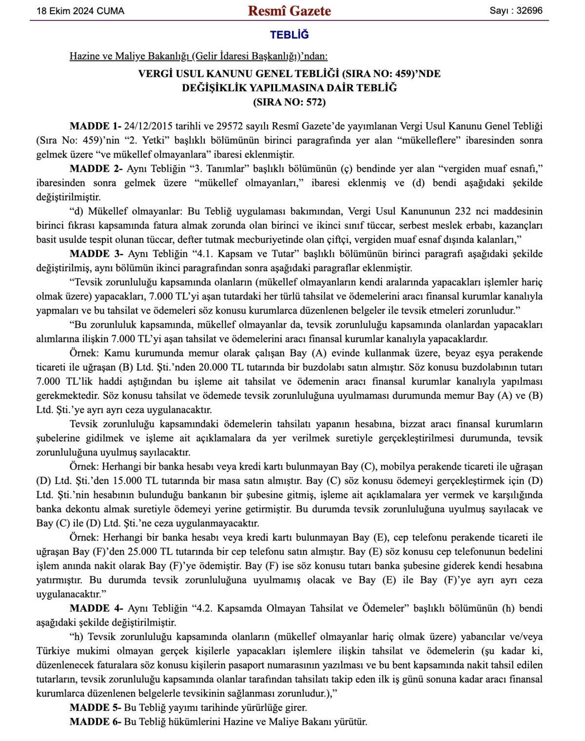 Resmi Gazete’de yayınlanan tebliğde yar alan örnekler şöyle: