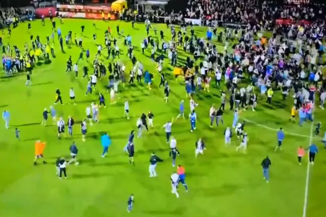 Galibiyetin ardından Grimsby Town taraftarı, kutlama yapmak adına tribünlerden yeşil zemine indi ve oyuncularla galibiyeti kutladı.