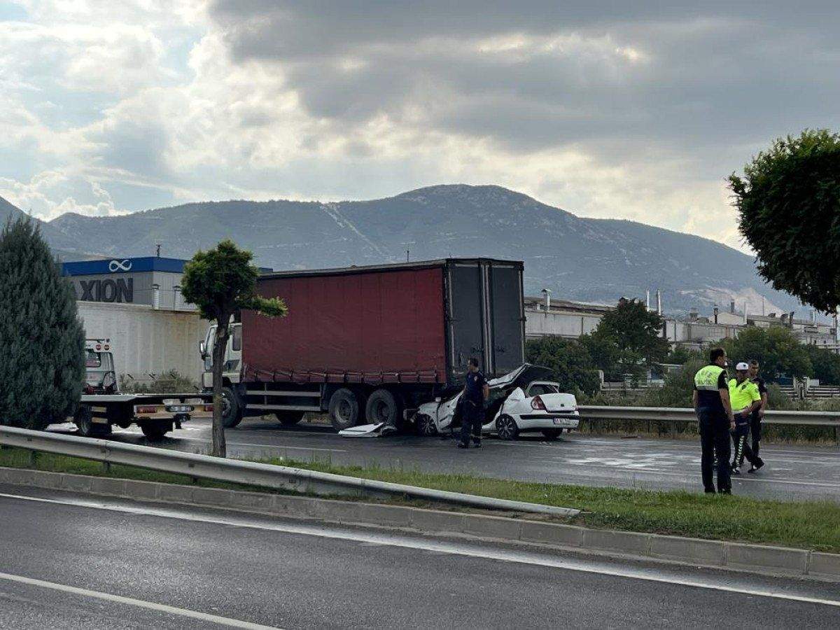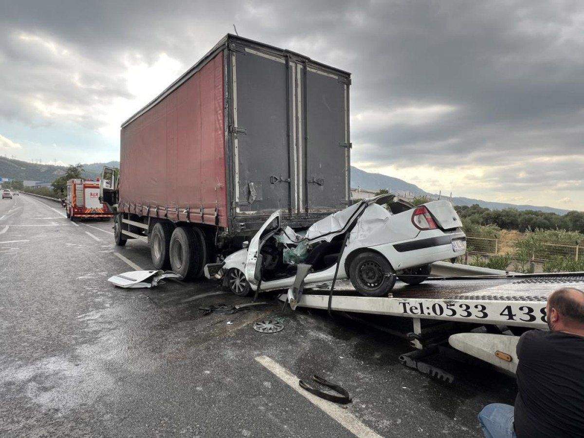 Manisa’nın Yunusemre ilçesi İzmir – İstanbul çevreyolu üzerinde A.V. idaresindeki 45 ALL 514 plakalı otomobil aynı istikamette seyir halindeki C.D. idaresindeki 35 BDD 416 plakalı kamyona arkadan çarptı.