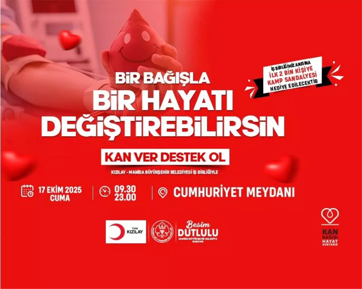 Manisa Büyükşehir Belediyesi ile Türk Kızılayı Ege Bölge Kan Merkezi Müdürlüğü, bir sosyal sorumluluk projesine daha imza atıyor. 17 Ekim Cuma günü düzenlenecek kan bağışı etkinliğinde, kan bağışında bulunan vatandaşlara kamp sandalyesi hediye edilecek.