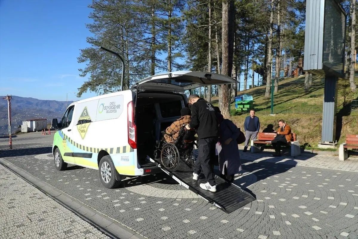 Ordu’da 90 yaşındaki yürüme engelli Yılmaz Doğan, Büyükşehir Belediyesinin “engelsiz taksi” hizmetinden faydalanarak 530 rakımlı Boztepe’den şehri izleme imkanı buldu.