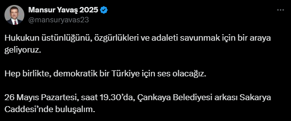 Mansur Yavaş, çağrısında, “Hukukun üstünlüğünü, özgürlükleri ve adaleti savunmak için bir araya geliyoruz. Hep birlikte, demokratik bir Türkiye için ses olacağız. 26 Mayıs Pazartesi, saat 19.30’da, Çankaya Belediyesi arkası Sakarya Caddesi’nde buluşalım” ifadelerini kullandı.