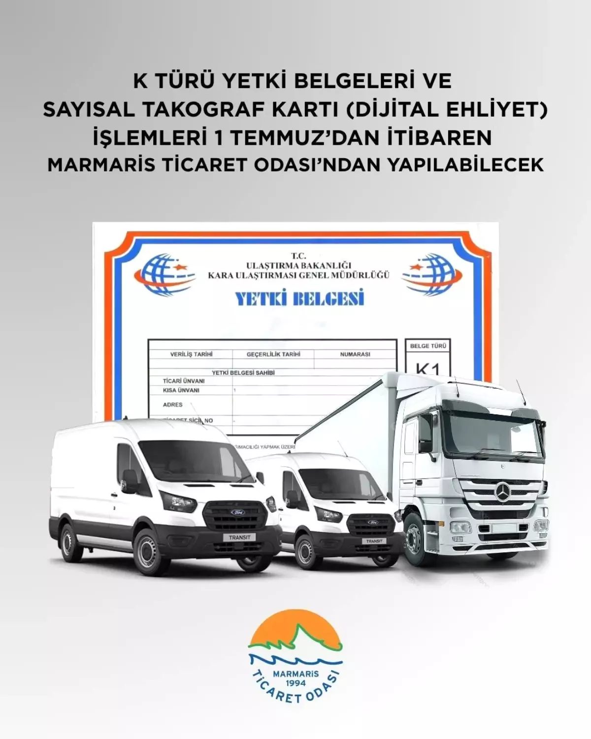 Ticari amaçla yurtiçi eşya taşımacılığı yapan, kendi adına ticari veya hususi olarak kayıt ve tescil edilmiş taşıtla sadece kendi esas iştigal konusu ile ilgili eşya taşımacılığı yapan veya ticari amaçla yurtiçi ev ve büro eşyası taşımacılığı yapan gerçek ve tüzel vergi mükelleflerinin alması zorunlu K Türü Yetki Belgeleri ile karayolu ile yolcu ve eşya taşımacılığı yapan ticari araçlar için zorunlu Sayısal Takograf Kartı (Dijital Ehliyet) işlemleri 1 Temmuz’dan itibaren Marmaris Ticaret Odası’ndan yapılabilecek.