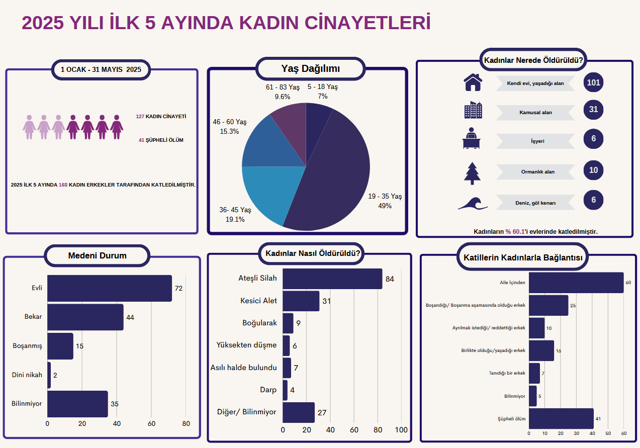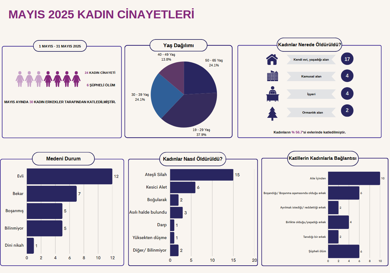 “1 Mayıs – 31 Mayıs 2025 tarihleri arasında 30 kadın erkekler tarafından katledilmiştir. 24 kadın cinayete kurban gitmiş, 6 kadının ölümü ise şüpheli olarak kaydedilmiştir. Cinayete kurban giden kadınların medeni durumlarına bakıldığında, 12’sinin evli, 7’sinin bekar, 5’inin boşanmış olduğu ve 1’inin dini nikahlı olduğu tespit edilmiştir.