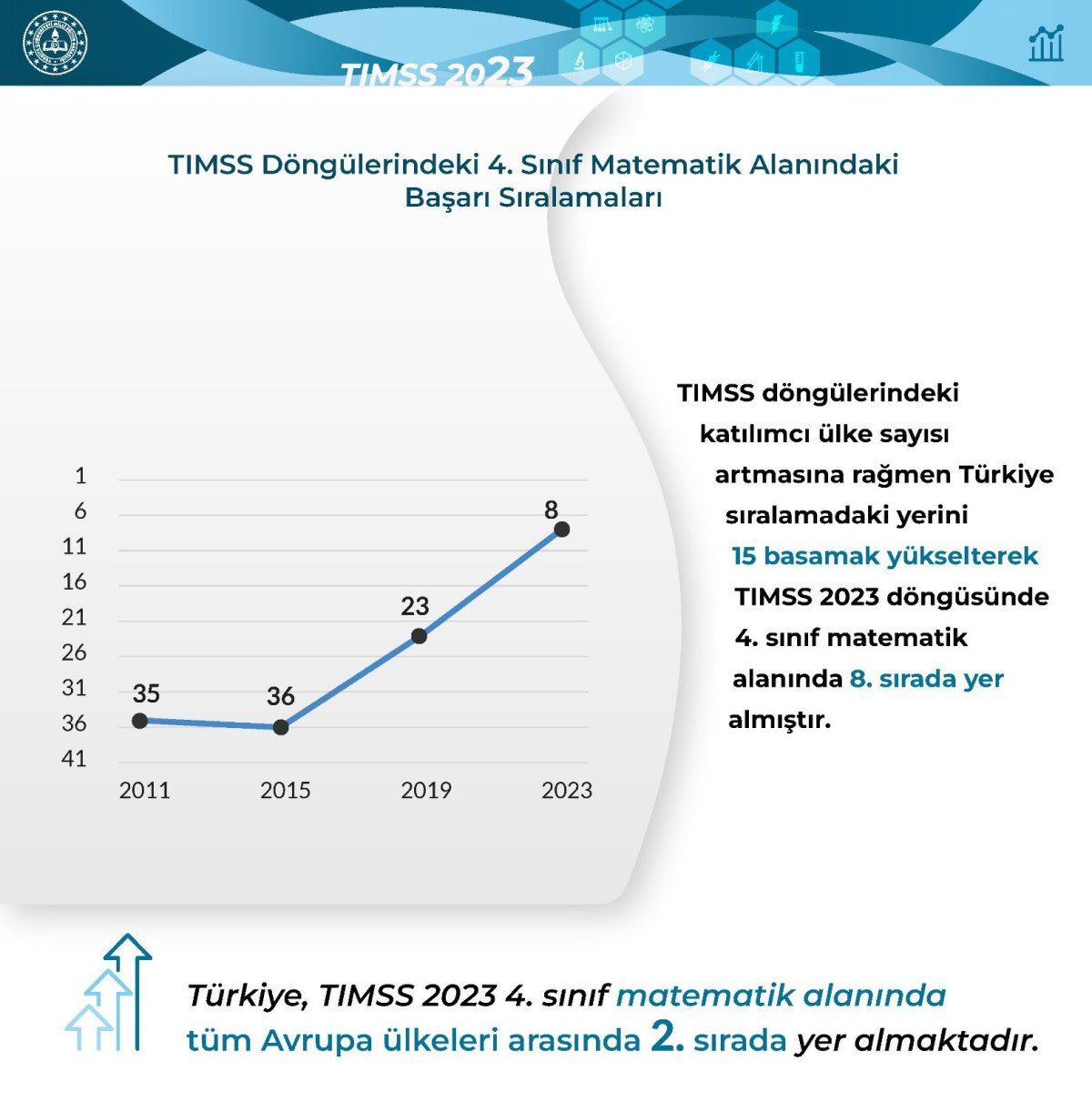 Milli Eğitim Bakanlığı’nın (MEB) yayınladığı 2023 TIMSS sonuçlarına göre, Türkiye’nin, dünya sıralamasındaki yerini yükselterek 4. sınıf “matematik” alanında Avrupa ülkeleri arasında ikinci oldu.