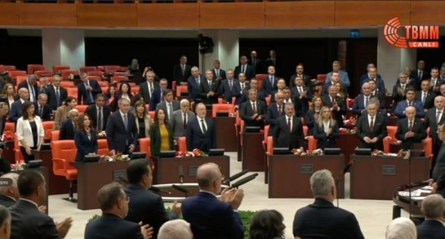 DEM Parti ve İYİ Parti dahil oturuma katılan partiler, Cumhurbaşkanı Recep Tayyip Erdoğan’ı ayakta karşıladı.