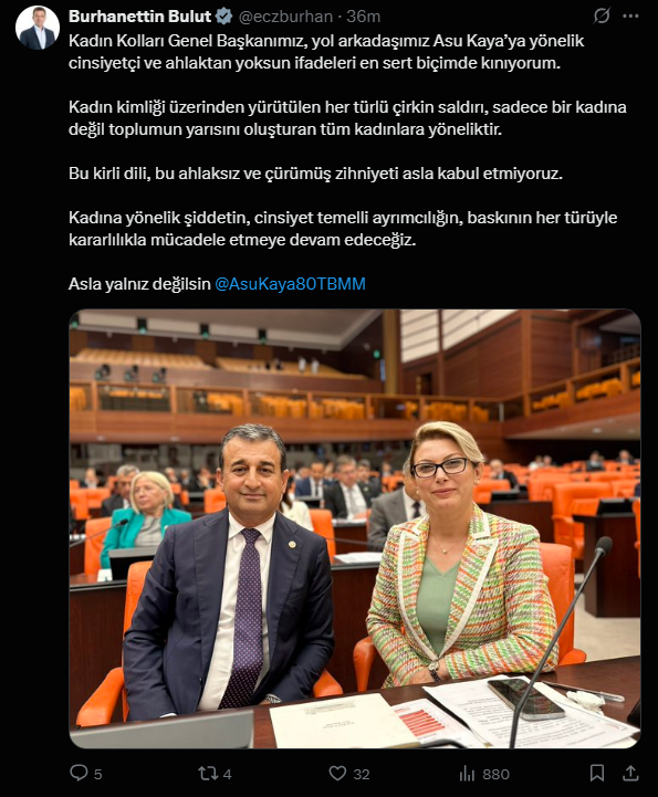 CHP Genel Başkan Yardımcısı ve Adana Milletvekili Burhanettin Bulut, mesaj krizine ilişkin sosyal medya hesabından yaptığı açıklamada, “Kadın Kolları Genel Başkanımız, yol arkadaşımız Asu Kaya’ya yönelik cinsiyetçi ve ahlaktan yoksun ifadeleri en sert biçimde kınıyorum. Kadın kimliği üzerinden yürütülen her türlü çirkin saldırı, sadece bir kadına değil toplumun yarısını oluşturan tüm kadınlara yöneliktir. Bu kirli dili, bu ahlaksız ve çürümüş zihniyeti asla kabul etmiyoruz. Kadına yönelik şiddetin, cinsiyet temelli ayrımcılığın, baskının her türüyle kararlılıkla mücadele etmeye devam edeceğiz. “ ifadelerini kullandı.