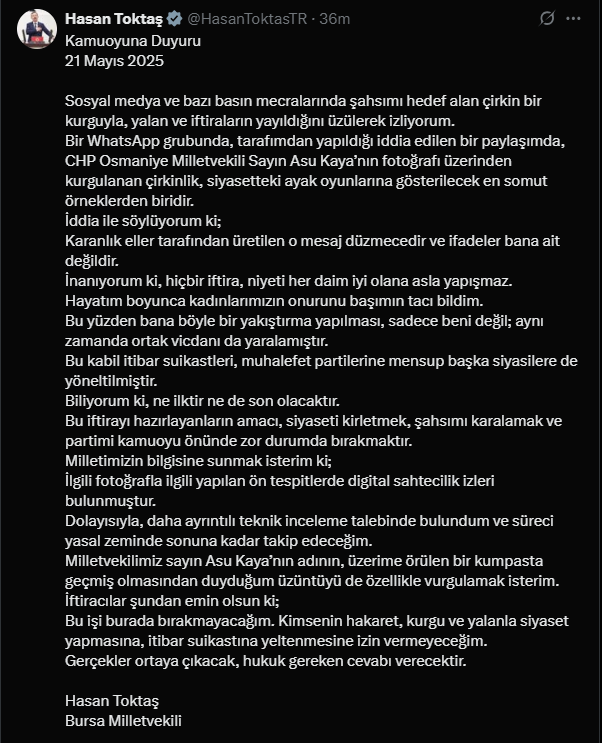 Hasan Toktaş ise “Sosyal medya ve bazı basın mecralarında şahsımı hedef alan çirkin bir kurguyla, yalan ve iftiraların yayıldığını üzülerek izliyorum. Bir WhatsApp grubunda, tarafından yapıldığı iddia edilen bir paylaşımda, CHP Osmaniye Milletvekili Sayın Asu Kaya’nın fotoğrafı üzerinden kurgulanan çirkinlik, siyasetteki ayak oyunlarına gösterilecek en somut örneklerden biridir.” ifadelerini kullanarak “İddia ile söylüyorum ki; Karanlık eller tarafından üretilen o mesaj düzmecedir ve ifadeler bana ait değildir.” açıklamasını yaptı.