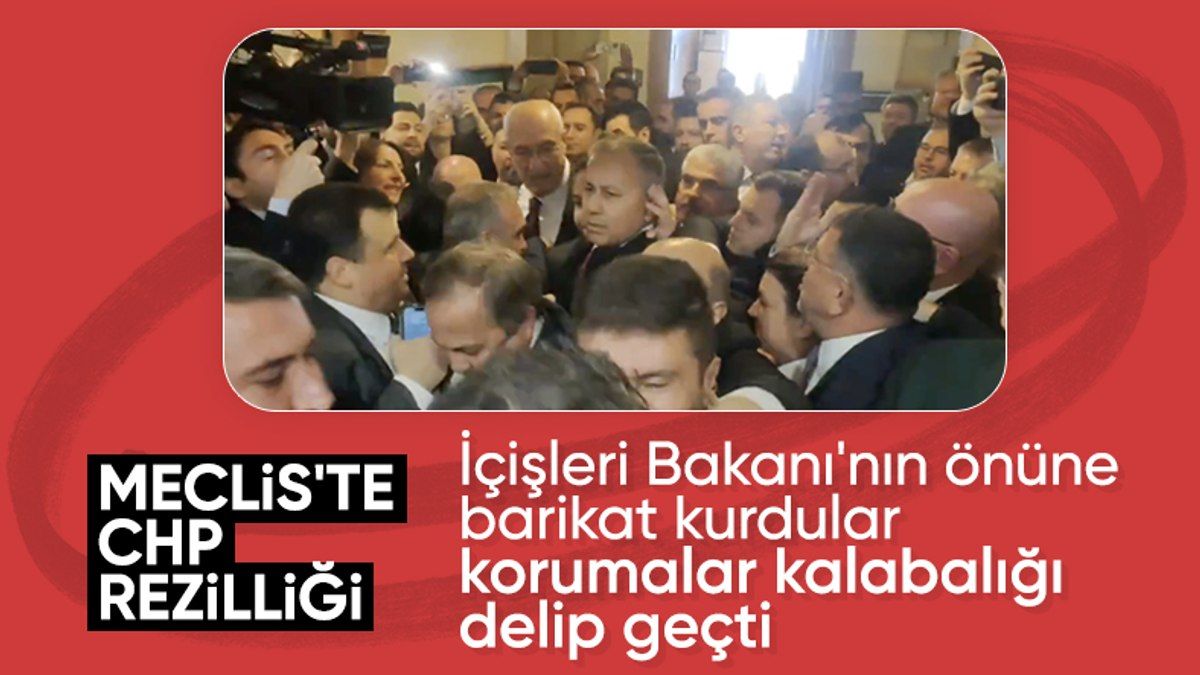 Görüşme salonuna gelen İçişleri Bakanı Ali Yerlikaya’ya kayyum atamaları nedeniyle tepki gösteren CHP’li vekiller, Bakan Yerlikaya’yı salona almamak için barikat kurdu.