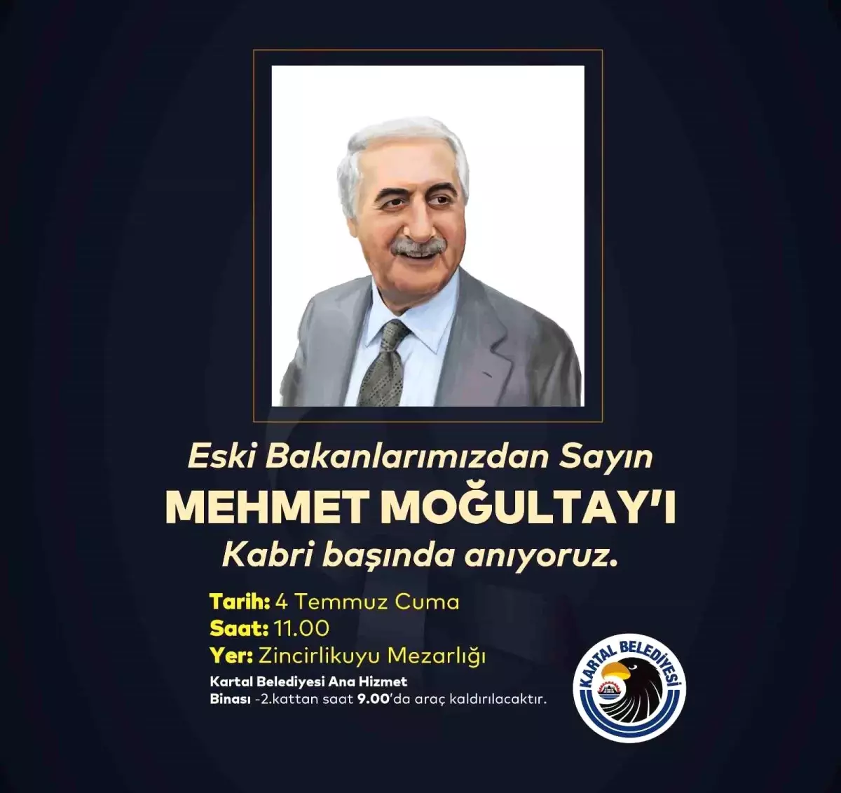 Kartal Belediyesi tarafından, avukat, siyasetçi, devlet adamı, Türkiye Büyük Millet Meclisi’nin 18’inci, 19’uncu ve 20’nci dönemlerinde İstanbul Milletvekilliği, 49’uncu hükümet döneminde Çalışma ve Sosyal Güvenlik Bakanlığı ve 50’nci hükümet döneminde Adalet Bakanlığı yapmış merhum Mehmet Moğultay için vefatının 8’inci yılında Zincirlikuyu Mezarlığı’nda bulunan kabri başında bir anma töreni düzenleyecek.