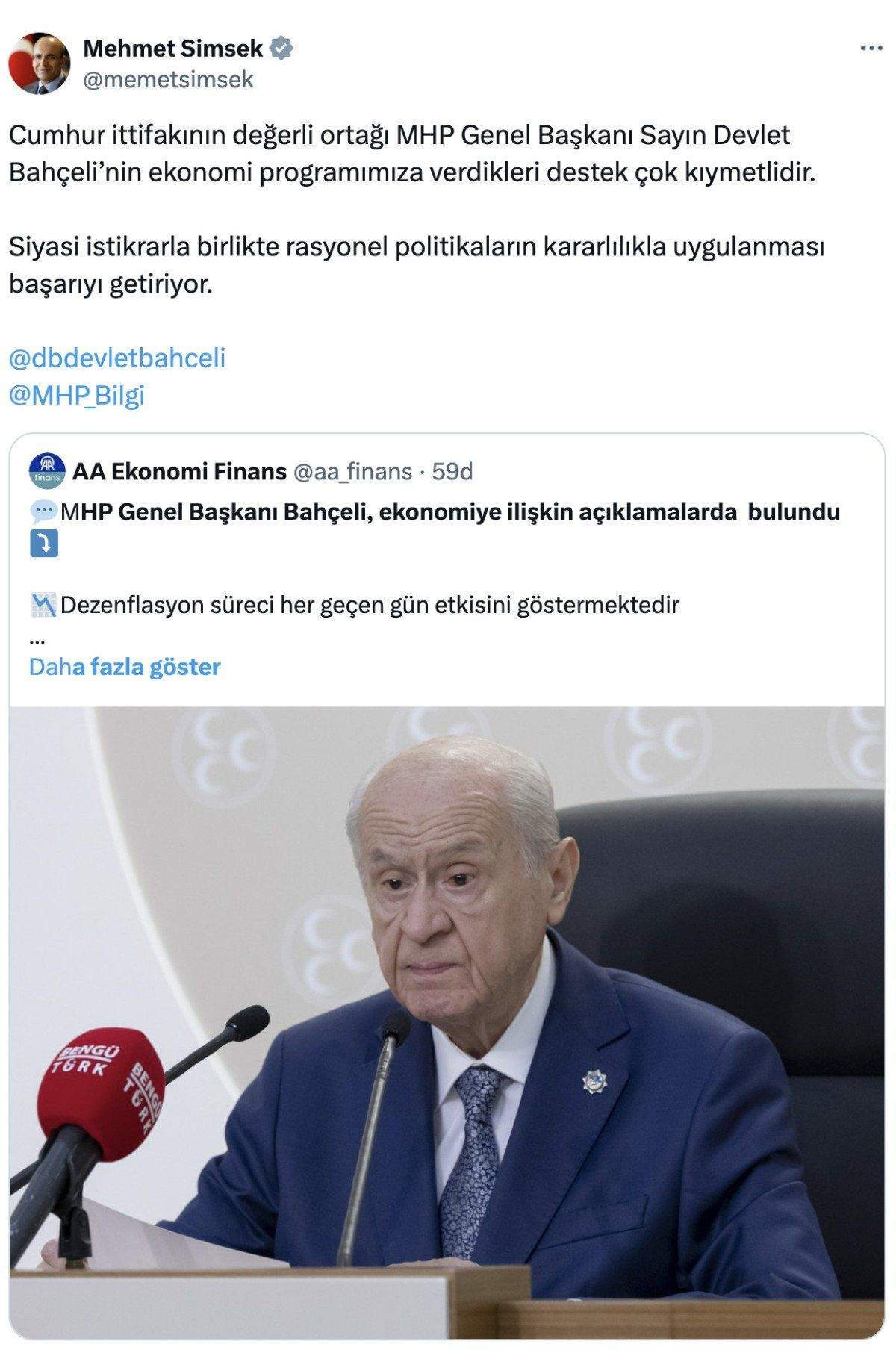 Bahçeli’nin “Türkiye ekonomisi güven verici adım ve hamlelerle istikrarlı ve umut uyandıran bir yükseliş kulvarındadır” sözlerini değerlendiren Şimşek, açıklamasını sosyal medyadan yayınladı.