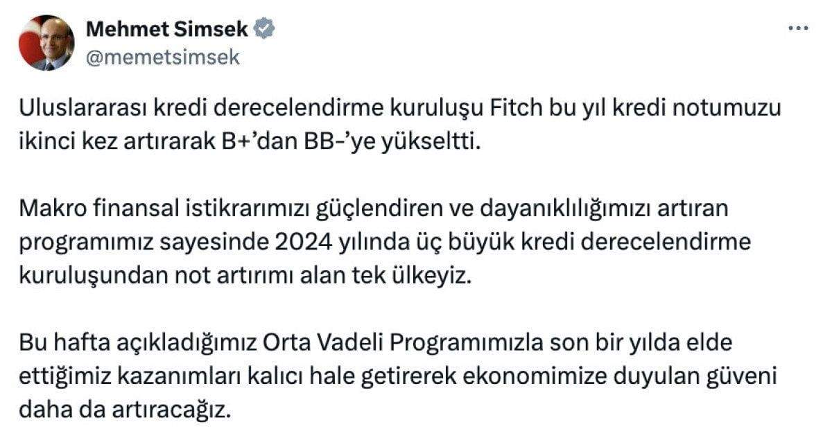 Hazine ve Maliye Bakanı Mehmet Şimşek, dün Fitch'in kredi notunu artırmasından sonra, Türkiye'nin "2024 yılında üç büyük kredi derecelendirme kuruluşundan not artırımı alan tek ülke" olduğunu belirtti.