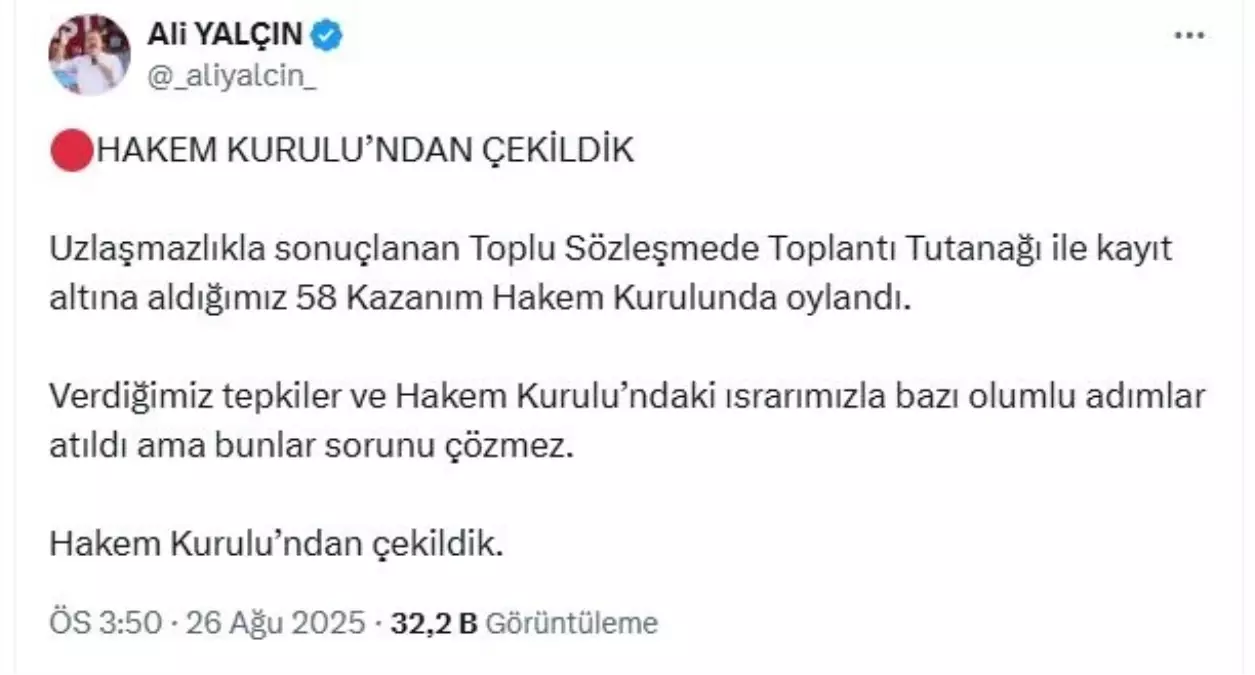Memur Sendikaları Konfederasyonu (Memur-Sen) Genel Başkanı Ali Yalçın, sosyal medya hesabından yaptığı açıklamada, “Uzlaşmazlıkla sonuçlanan Toplu Sözleşme’de toplantı tutanağı ile kayıt altına aldığımız 58 kazanım, Hakem Kurulu’nda oylandı. Verdiğimiz tepkiler ve Hakem Kurulu’ndaki ısrarımızla bazı olumlu adımlar atıldı ama bunlar sorunu çözmez. Hakem Kurulu’ndan çekildik” dedi.