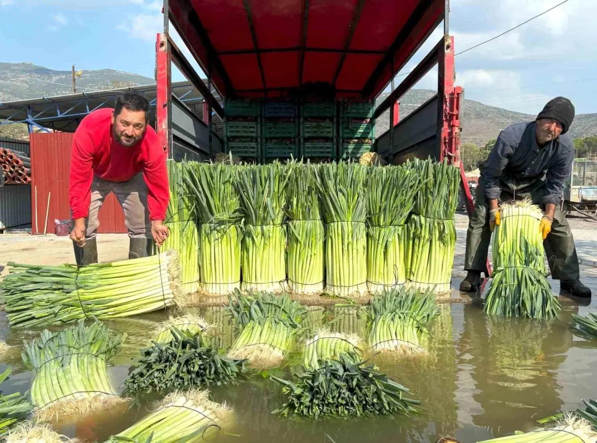 Menemen'de kış sebzesi pırasanın hasadı başladı, üreticiler tarladan sofralara ürünlerini ulaştırıyor.