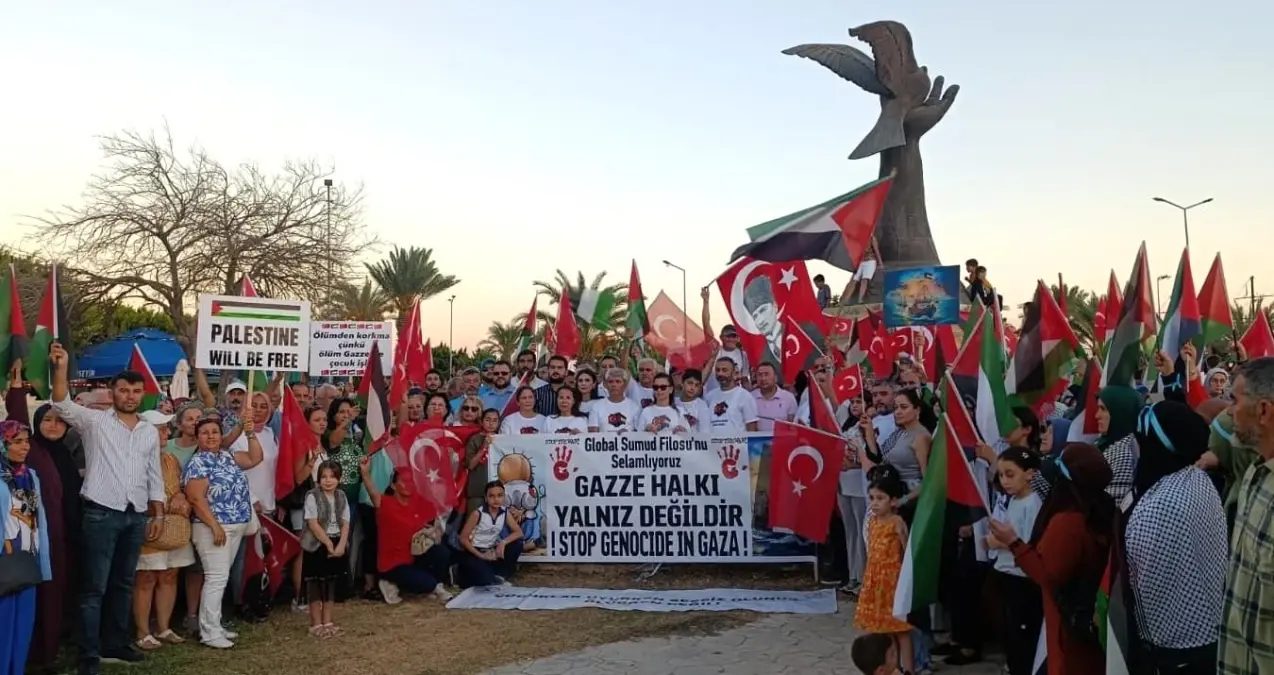 Mersin’de bir araya gelen Filistin destekçisi grup, Gazze’ye insani yardım ulaştırmak amacıyla yola çıkan Küresel Sumud Filosu’na olan desteklerini dile getirdi.