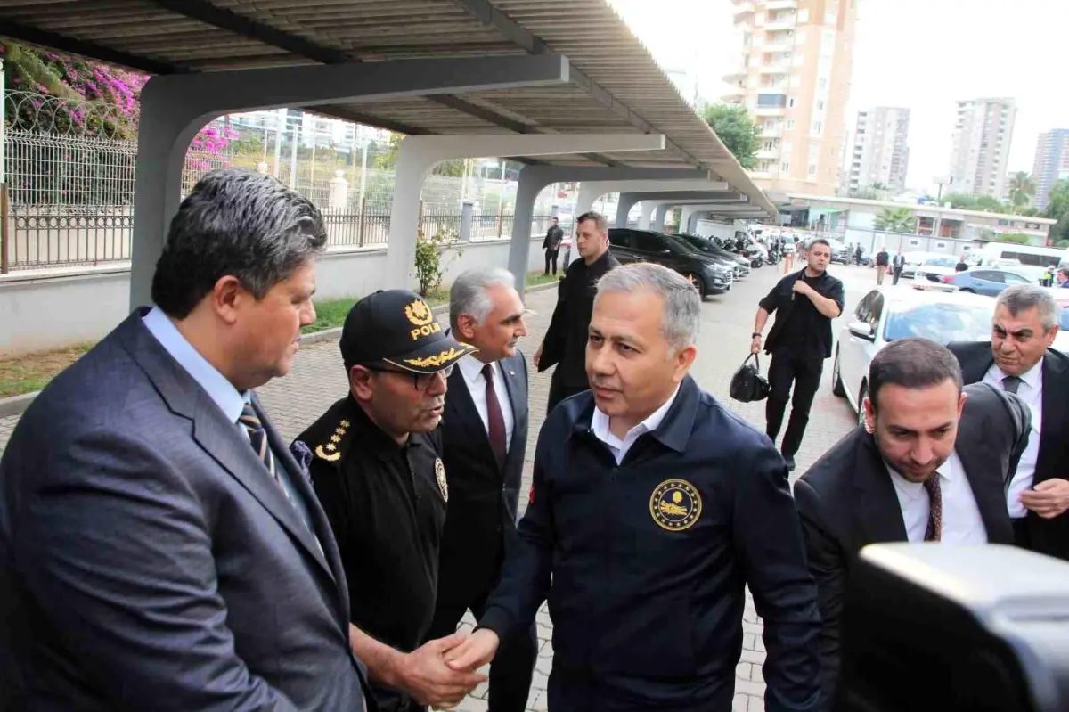Açıklama sırasında Bakan Yerlikaya’ya, Emniyet Genel Müdür Yardımcısı Ömer Urhal, Vali Atilla Toros ve İl Emniyet Müdürü İdris Yılmaz eşlik etti. – MERSİN