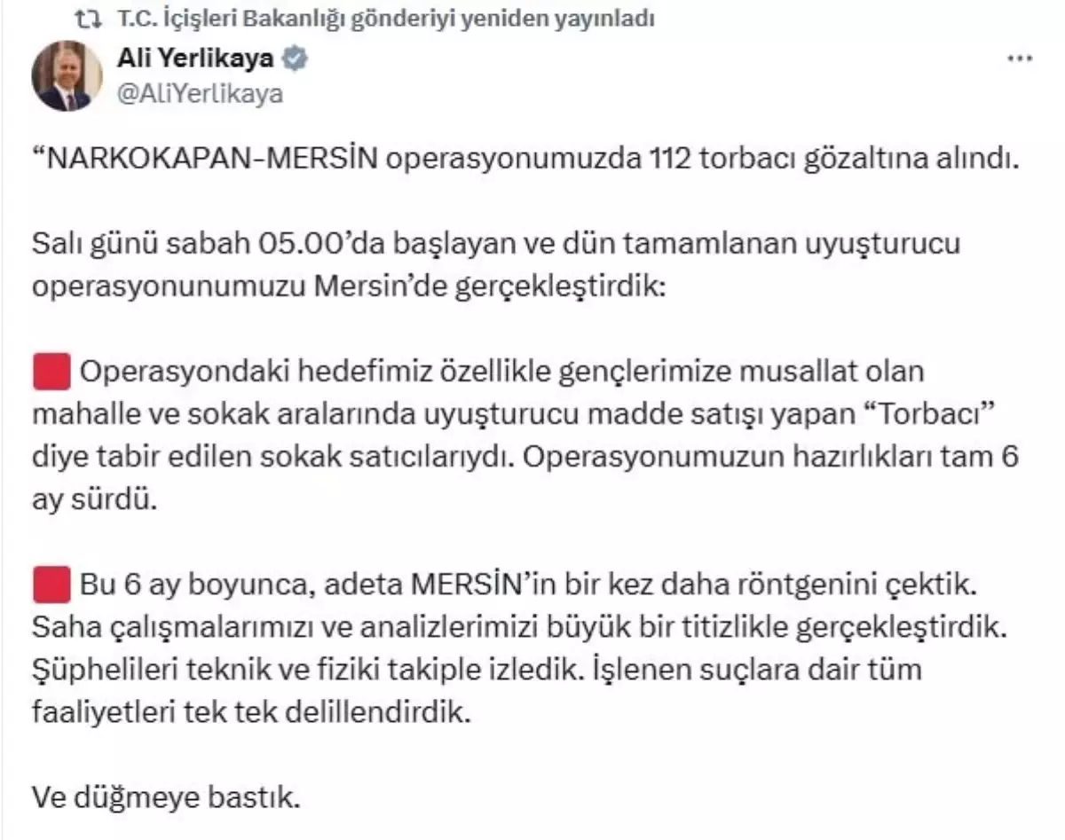 İÇİŞLERİ Bakanı Ali Yerlikaya, ‘Narkokapan- Mersin’ operasyonunda ‘Torbacı’ olarak tabir edilen 112 uyuşturucu satıcısının yakalandığını, 84’ünün tutuklandığını açıkladı.