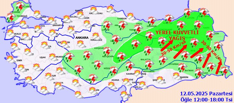 Yağışların; Doğu Karadeniz, Doğu Anadolu’nun kuzeyi ile Kayseri, Sivas, Bingöl ve Muş çevrelerinde yerel kuvvetli olması beklendiğinden yaşanabilecek olumsuzluklara karşı dikkatli ve tedbirli olunmalıdır.