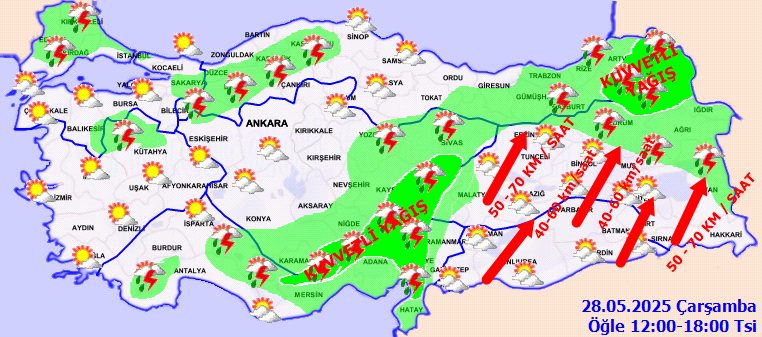 Meteoroloji Genel Müdürlüğü tarafından yapılan tahminlere göre: Ülkemiz genelinin parçalı yer yer çok bulutlu, Trakya, Doğu Akdeniz, İç Anadolu’nun güney ve doğusu, Batı Karadeniz’in iç kesimleri, Doğu Karadeniz, Doğu Anadolu’nun kuzeydoğusu ile İstanbul’un kuzeyi, Antalya’nın iç kesimleri, Balıkesir’in doğusu, Bursa’nın güneyi, Sakarya çevreleri, Malatya çevreleri ve Van’ın doğu ilçelerinin sağanak ve gök gürültülü sağanak yağışlı geçeceği tahmin ediliyor. Yağışların; Adana ve Mersin’in kuzeyi, Osmaniye çevreleri, Kahramanmaraş’ın kuzey ve batısı, Hatay’ın kuzey ilçeleri, Sivas’ın güneyi, Malatya’nın kuzey ve batısı, Kayseri ve Niğde’nin güney ve doğusu ile Aksaray ve Nevşehir çevreleri, Ardahan ve Kars çevreleri, Artvin’in iç kesimleri ile Erzurum’un doğu ilçelerinde yerel kuvvetli olması bekleniyor. Rüzgarın; doğu bölgelerde güney ve güneybatı yönlerden kuvvetli ve yer yer fırtına olarak (50-70 km/saat) esmesi tahmin ediliyor.