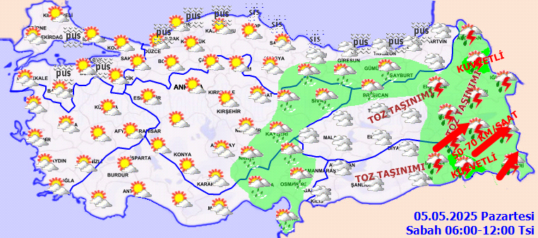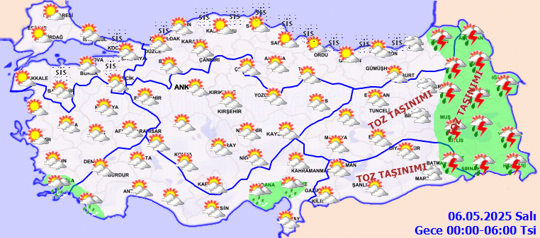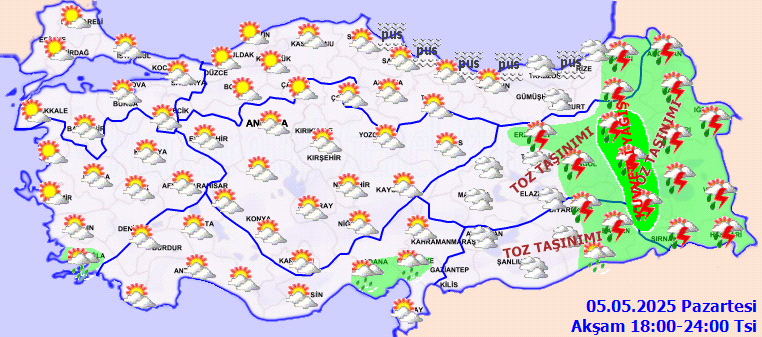 Yağışların; Doğu Anadolu’nun kuzeydoğusu ile Muş, Bitlis, Şırnak, Hakkari ve Siirt çevrelerinde yer yer kuvvetli olması bekleniyor. Sabah ve gece saatlerinde Marmara ve Karadeniz kıyılarında pus ve yer yer sis hadisesinin görüleceği tahmin ediliyor. Doğu Anadolu ile Güneydoğu Anadolu’da toz taşınımı bekleniyor.
