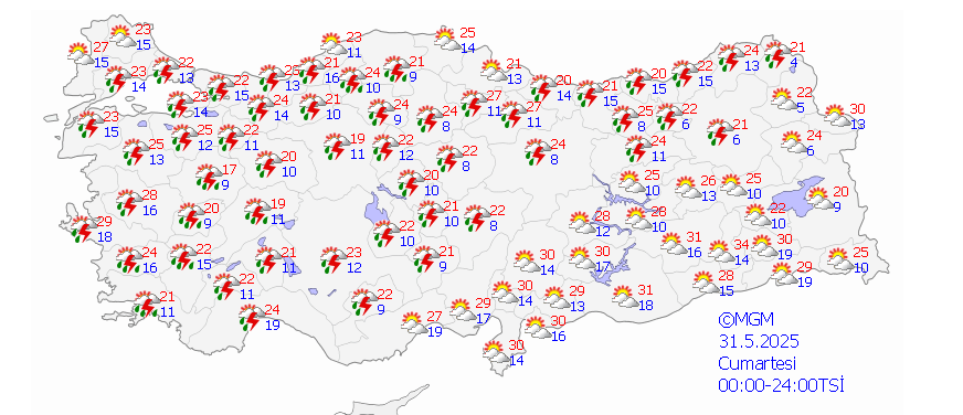 Meteoroloji Genel Müdürlüğü tarafından yapılan tahminlere göre yurt genelinin parçalı ve çok bulutlu, Marmara’nın batısı, Ege’nin güney ve doğusu, Akdeniz, İç Anadolu, Batı Karadeniz’in iç kesimleri, Doğu Karadeniz, Doğu Anadolu’nun kuzey ve doğusu ile Çorum ve Ordu çevrelerinin sağanak ve gök gürültülü sağanak yağışlı geçeceği tahmin ediliyor. Yağışların, Ege’nin güneydoğusu, Batı Akdeniz, İç Anadolu’nun güneyi ile Edirne, Kırklareli, Tekirdağ, Adana, Ankara ve Çankırı çevrelerinde yerel kuvvetli olması bekleniyor.