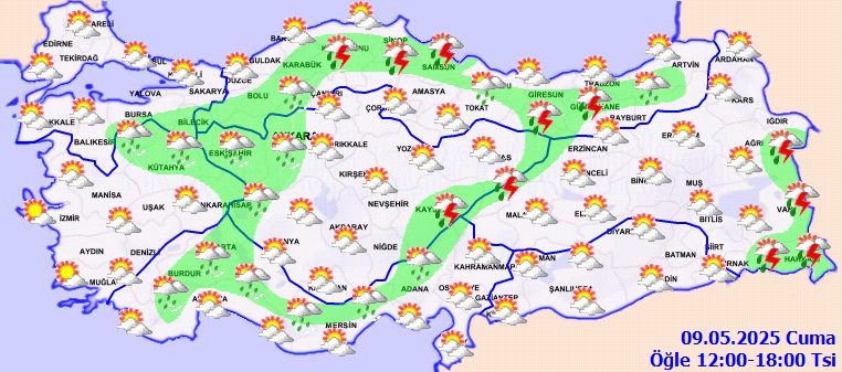 MGM tarafından yayımlanan 9 mayıs tarihli hava tahmin raporuna göre: Yurt genelinin parçalı, yer yer çok bulutlu, Marmara’nın güneydoğu, Trakya’nın batı kesimleri, Ege’nin doğusu, Batı Akdeniz’in iç kesimleri, Doğu Akdeniz’in Toroslar kesimi, İç Anadolu’nun kuzeybatısı, Batı Karadeniz’in iç kesimleri, Orta Karadeniz kıyıları ve Doğu Anadolu’nun doğusu ile Gümüşhane ve Kayseri çevrelerinin yerel sağanak ve gök gürültülü sağanak yağışlı geçeceği tahmin ediliyor.