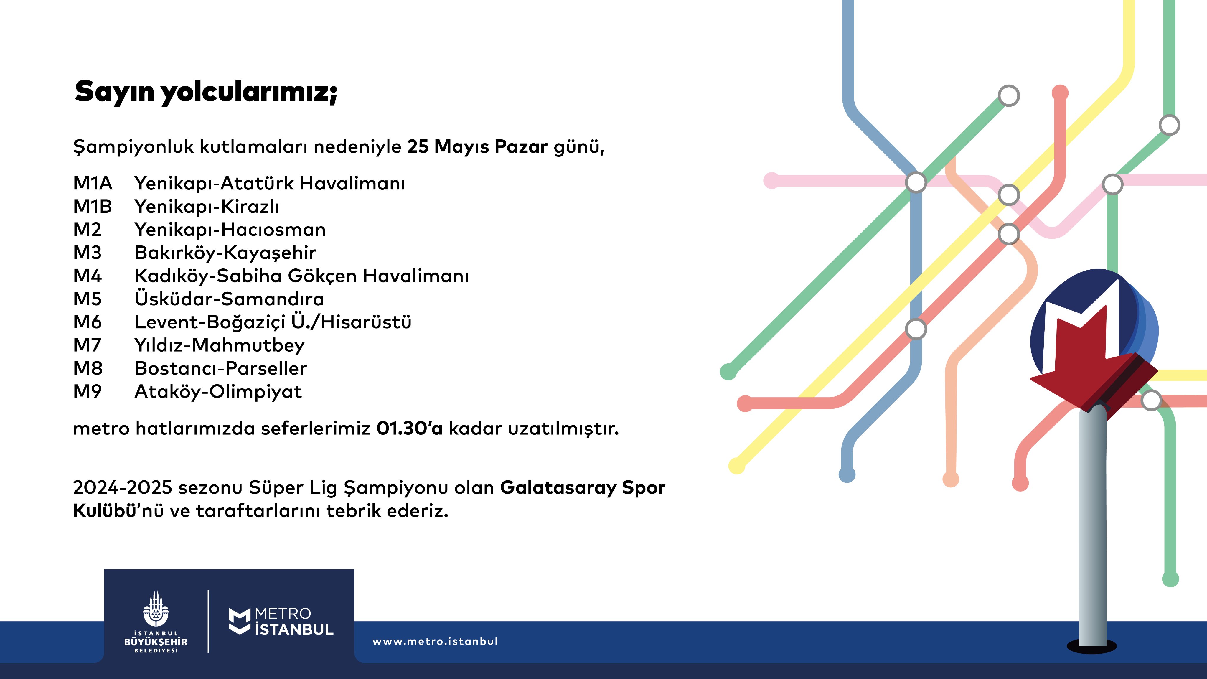 Yapılan duyuruda, “2024-2025 sezonu Süper Lig Şampiyonu olan Galatasaray Spor Kulübü’nü ve büyük taraftarlarını tebrik ederiz” ifadelerine yer verilirken, kutlamaya katılacak vatandaşların sefer saatlerini dikkate alması istendi. İstanbul’da toplu taşımanın merkezinde yer alan metro hatlarının uzatılmasıyla, kutlamaların ardından evlerine dönecek binlerce Galatasaray taraftarının ulaşımda sıkıntı yaşamaması hedefleniyor.