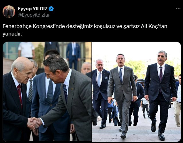 Ali Koç’un MHP Genel Merkezi’nde Devlet Bahçeli’yi ziyaret ettiği fotoğraf karelerini paylaşan MHP Genel Başkan Başdanışmanı Eyyüp Yıldız, “Fenerbahçe Kongresi’nde desteğimiz koşulsuz ve şartsız Ali Koç’tan yanadır.” ifadelerine yer verdi.