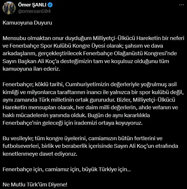 Aynı dakikalarda Ankara İl Başkanı Ömer Şanlı da sosyal medya hesabı üzerinden yaptığı paylaşımla Koç’a olan desteğini ilan etti. Şanlı, söz konusu paylaşımında, “Mensubu olmaktan onur duyduğum Milliyetçi-Ülkücü Hareketin bir neferi ve Fenerbahçe Spor Kulübü Kongre Üyesi olarak; şahsım ve dava arkadaşlarım, gerçekleştirilecek Fenerbahçe Olağanüstü Kongresi’nde Sayın Başkan Ali Koç’a desteğimizin tam ve koşulsuz olduğunu tüm kamuoyuna ilan ederiz.