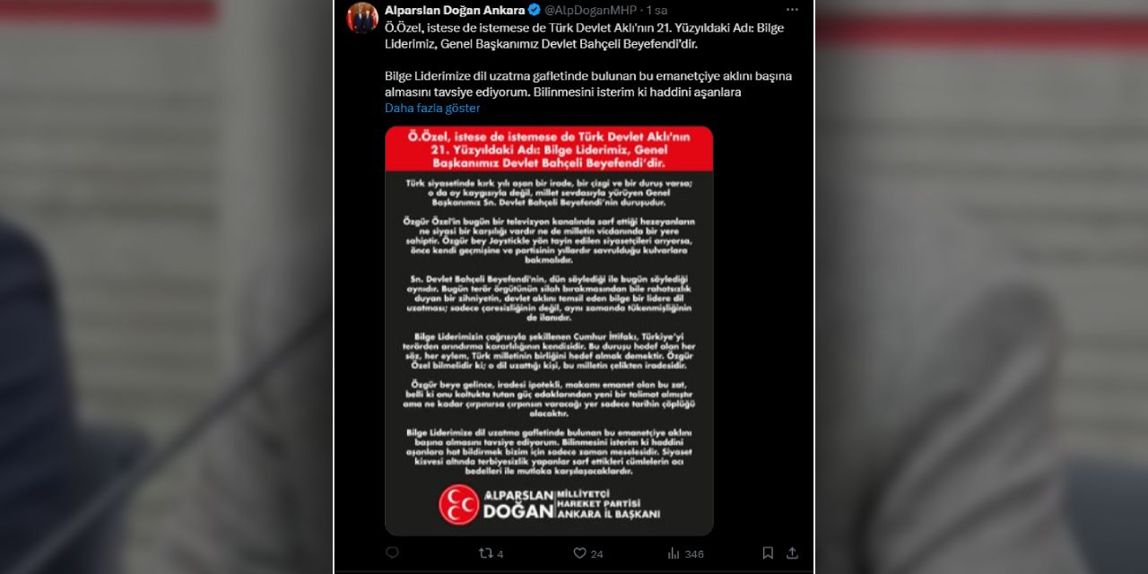 MHP Ankara İl Başkanı Alparslan Doğan, Özel‘in MHP Genel Başkanı Devlet Bahçeli‘yi eleştirdiği sözlerine tehdit ifadeleri ile yanıt verdi.