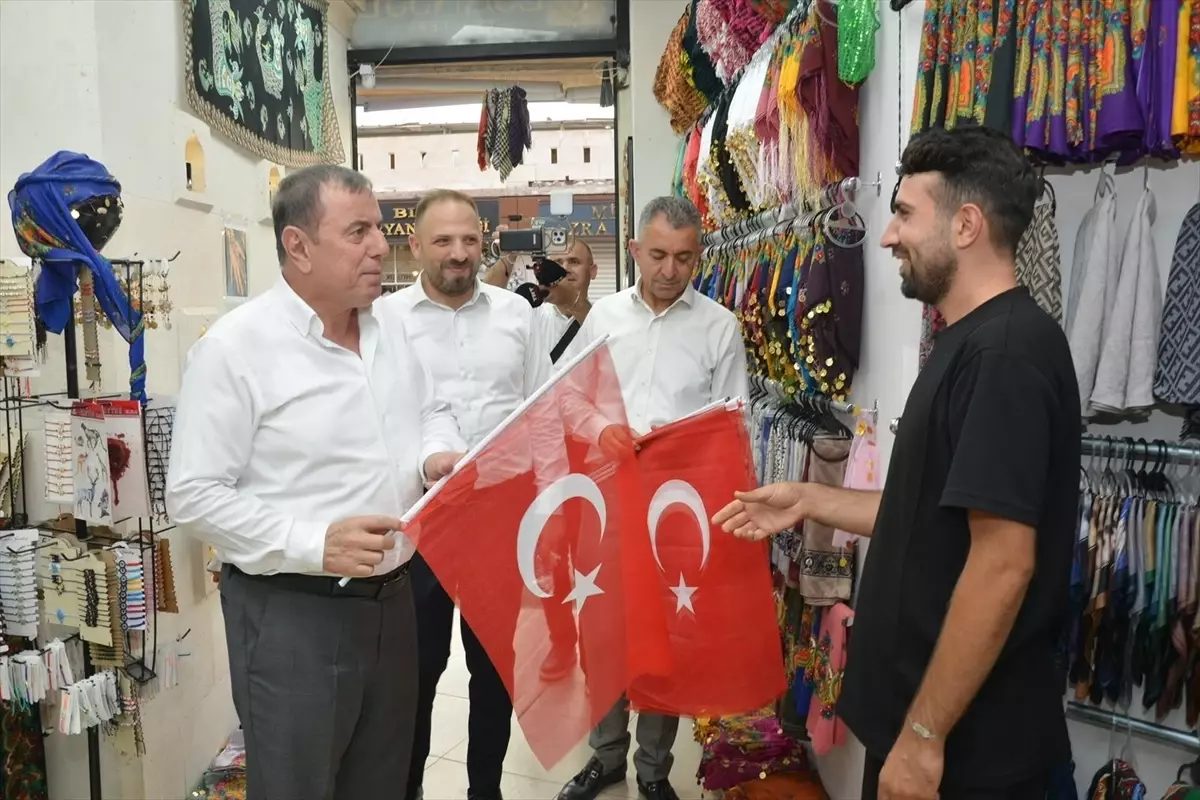 Midyat Belediye Başkanı Veysi Şahin ve AK Parti İlçe Başkanı Atilla Yarış, partililerle birlikte esnafı ziyaret ederek, Türk bayrağı verdi.